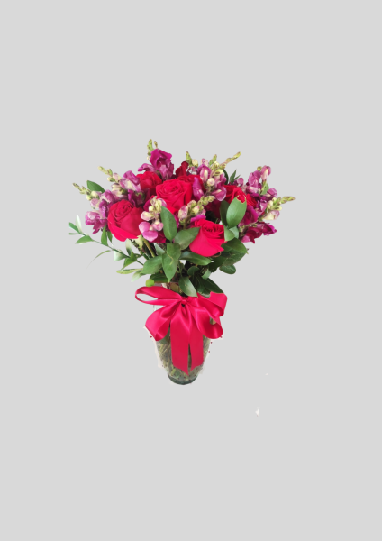 Jarron de rosas rojas con snapdragon ( tono segun disponibilidad )